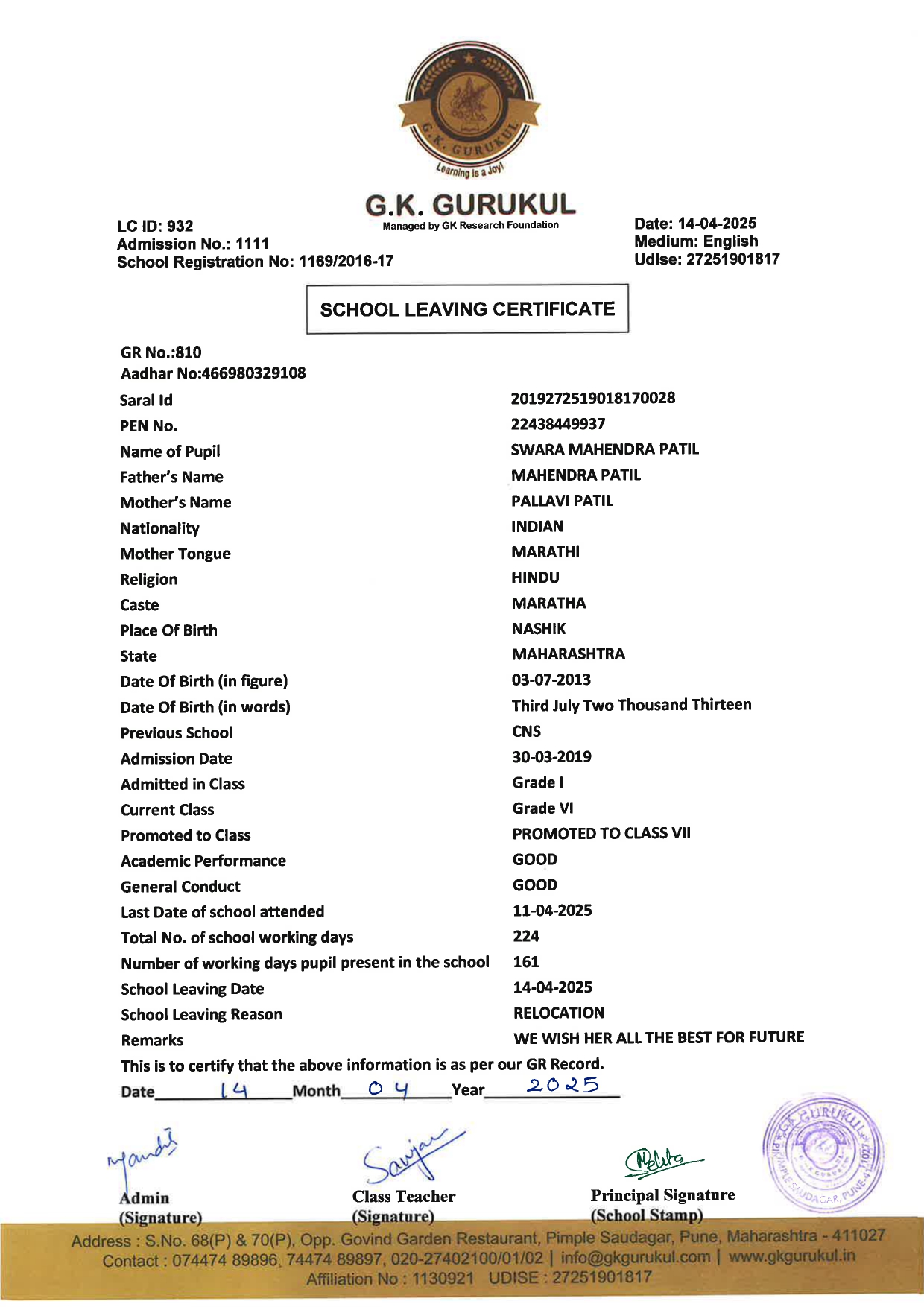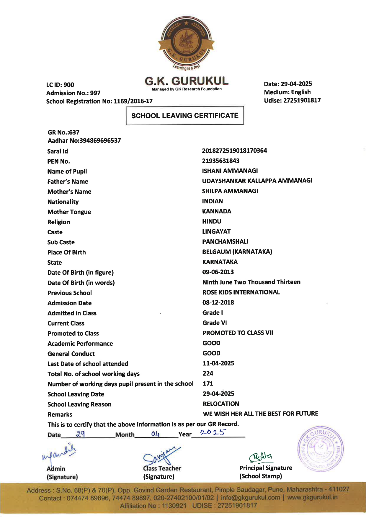 | 178 | 2024-25 | 898 | ANAYA YOGESH HARANE | 12-04-2025 | Grade III Morning - C | RELOCATION |